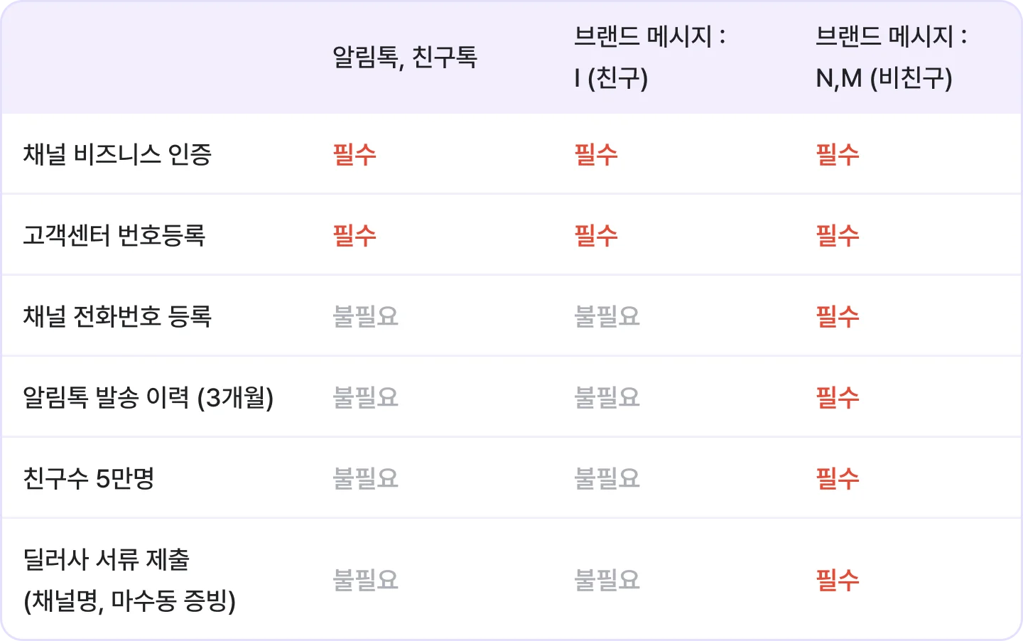 발송 범위가 확대되긴 했지만 친구가 아닌 사용자(비친구)에게 보낼 수 있는 N, M타입을 활용할 수 있는 채널은 매우 제한적이에요. 스팸 및 불법 스미싱에 대한 규제가 커지고 있는 상황이라서 광고성 메시지를 보낼 수 있는 채널에 제약을 둔 거거든요.