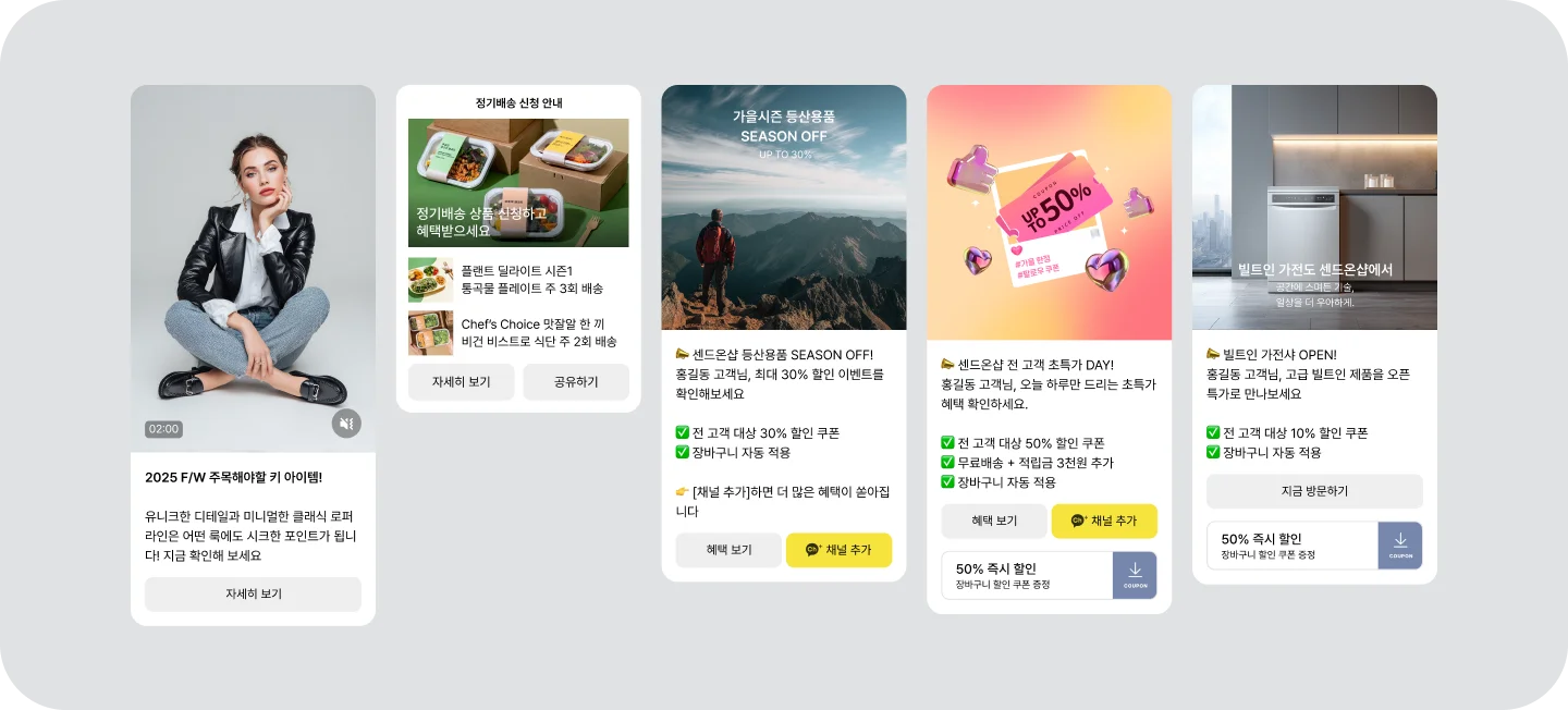 브랜드메시지는 기존 친구톡과 똑같이 여러 가지 다양한 레이아웃을 그대로 제공해요. 상황에 맞게 다양한 옵션들을 그대로 활용할 수 있답니다.
