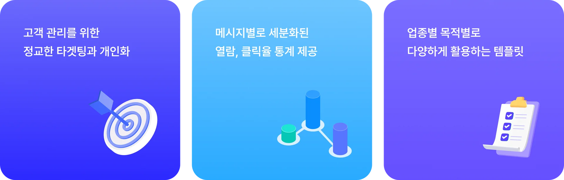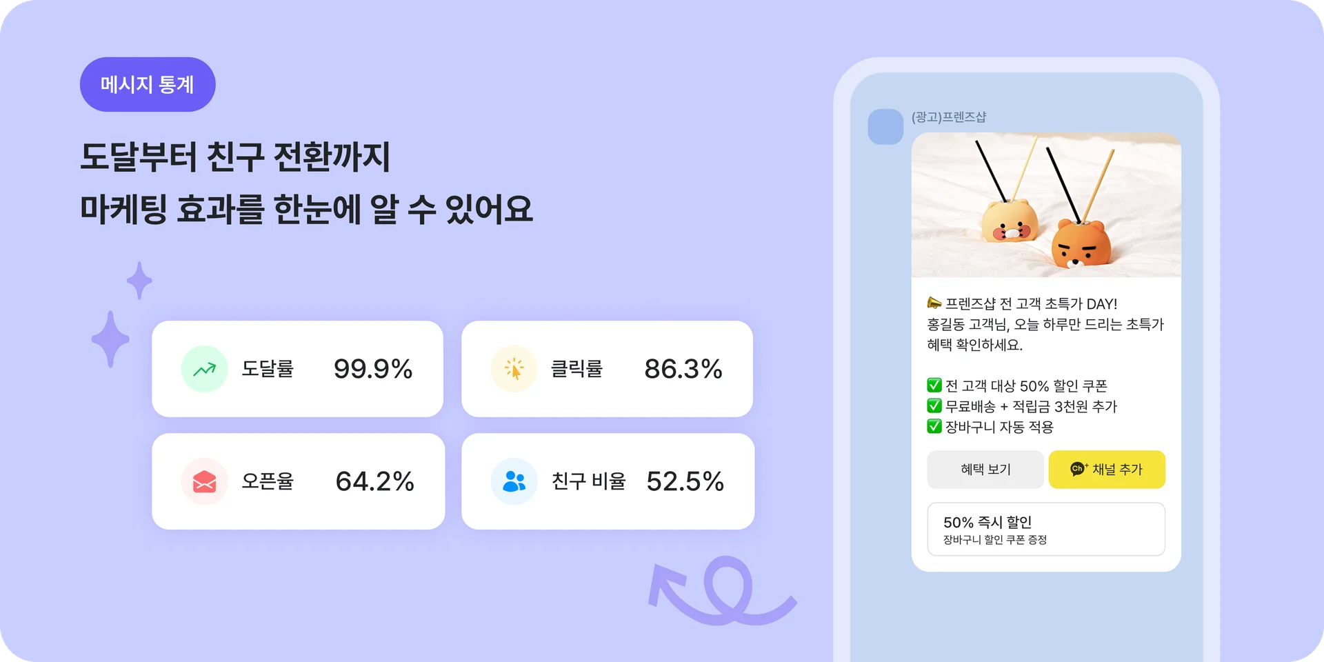 발송/열람/클릭 효율 통계 제공 : 실시간으로 얼마나 많은 고객이 메시지를 확인했는지 파악할 수 있어요