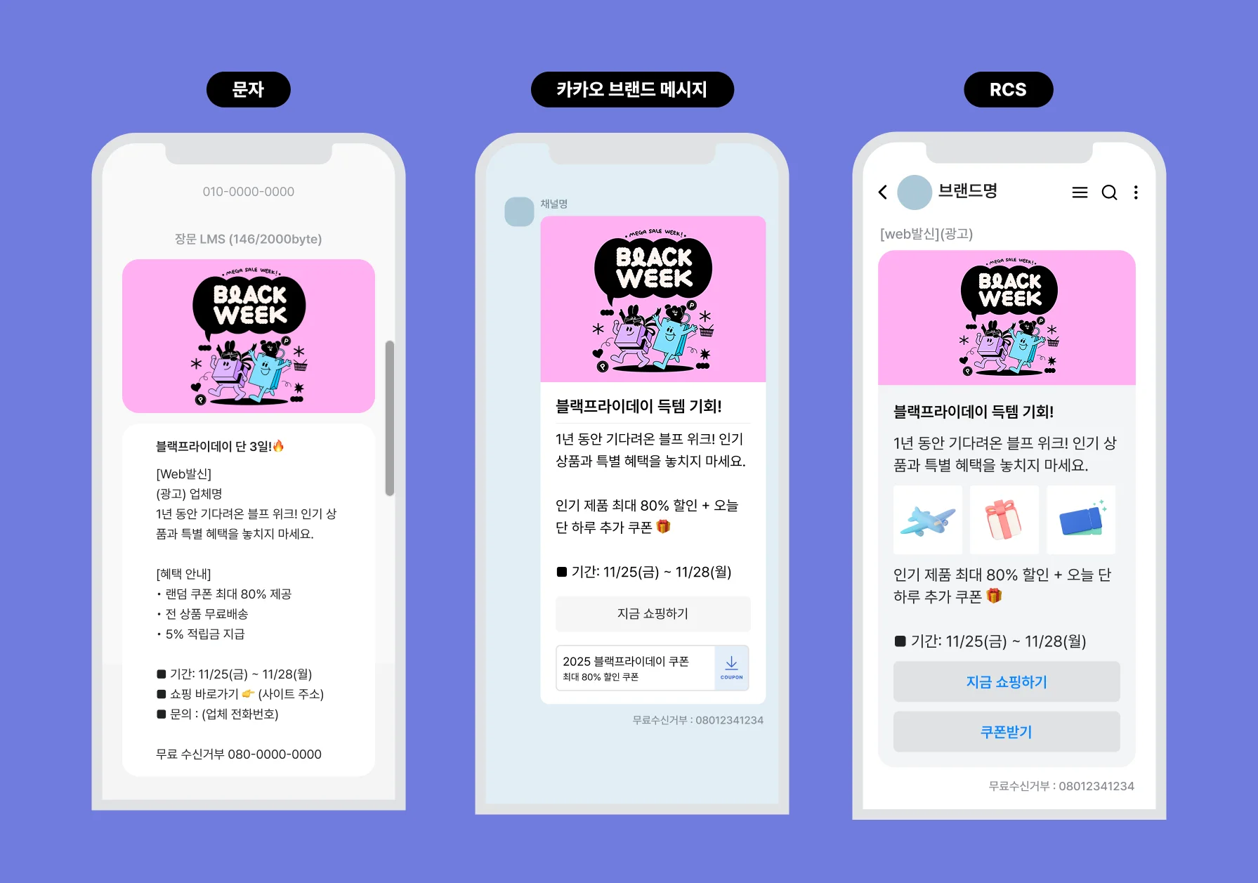 문자, RCS, 카카오브랜드메시지 모두 동일하게 적용 가능합니다.