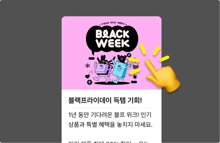메시지 캠페인, 텍스트만 보내는 걸로는 아쉬울 때가 많아요. 특히 블랙프라이데이, 크리스마스, 연말파티처럼 시각적 요소가 중요한 시즌에는 이미지 카드, 배너, 버튼 등을 활용하면 클릭률과 참여율이 훨씬 높아집니다.