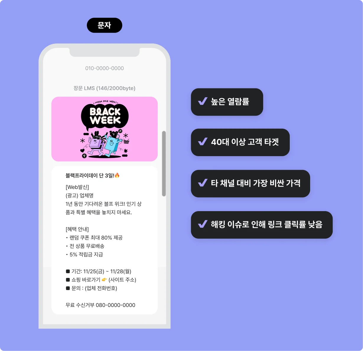 • SMS의 경우, 글자 수 제한(보통 90자)에 따른 간결한 메시지 필요