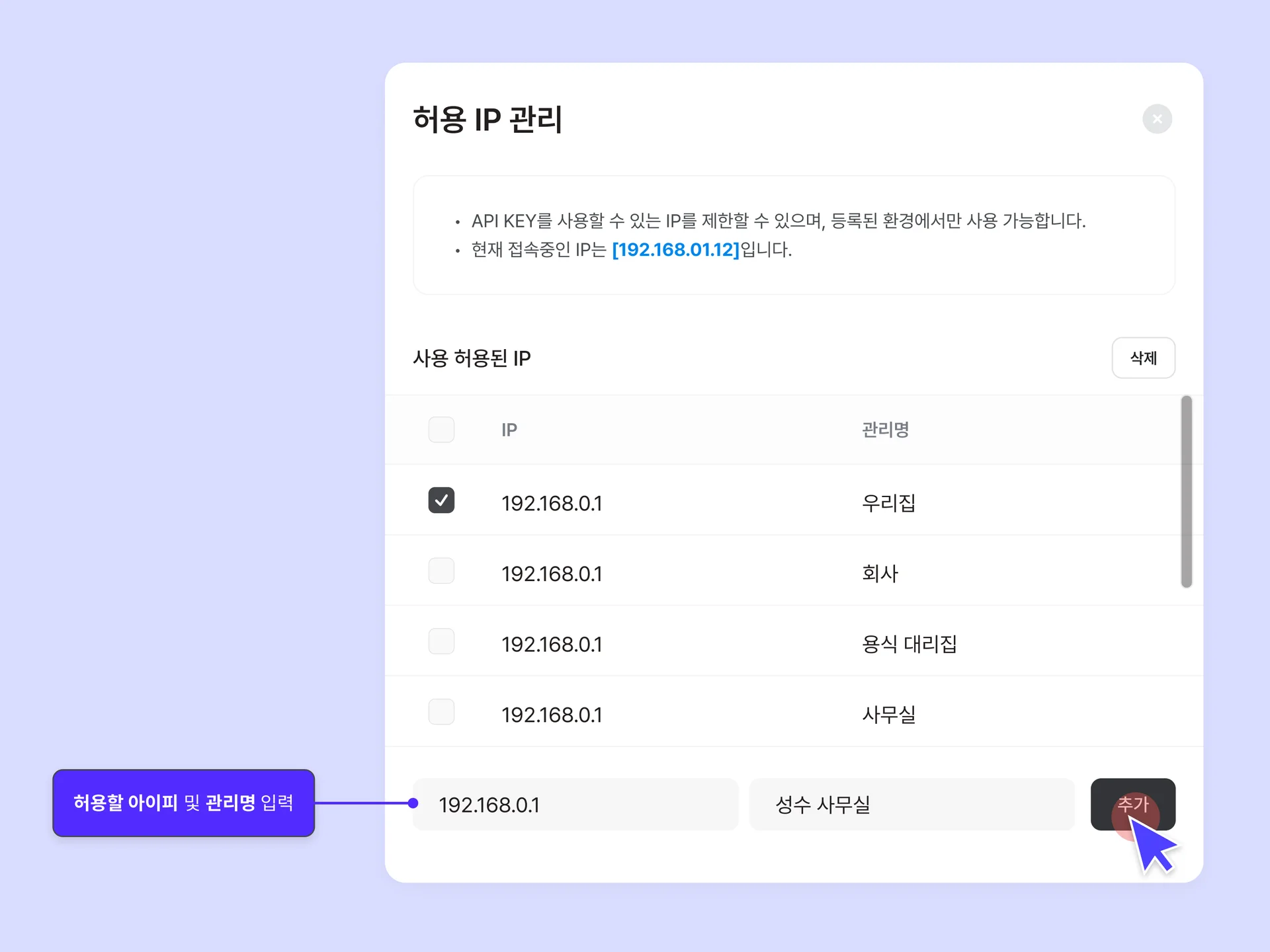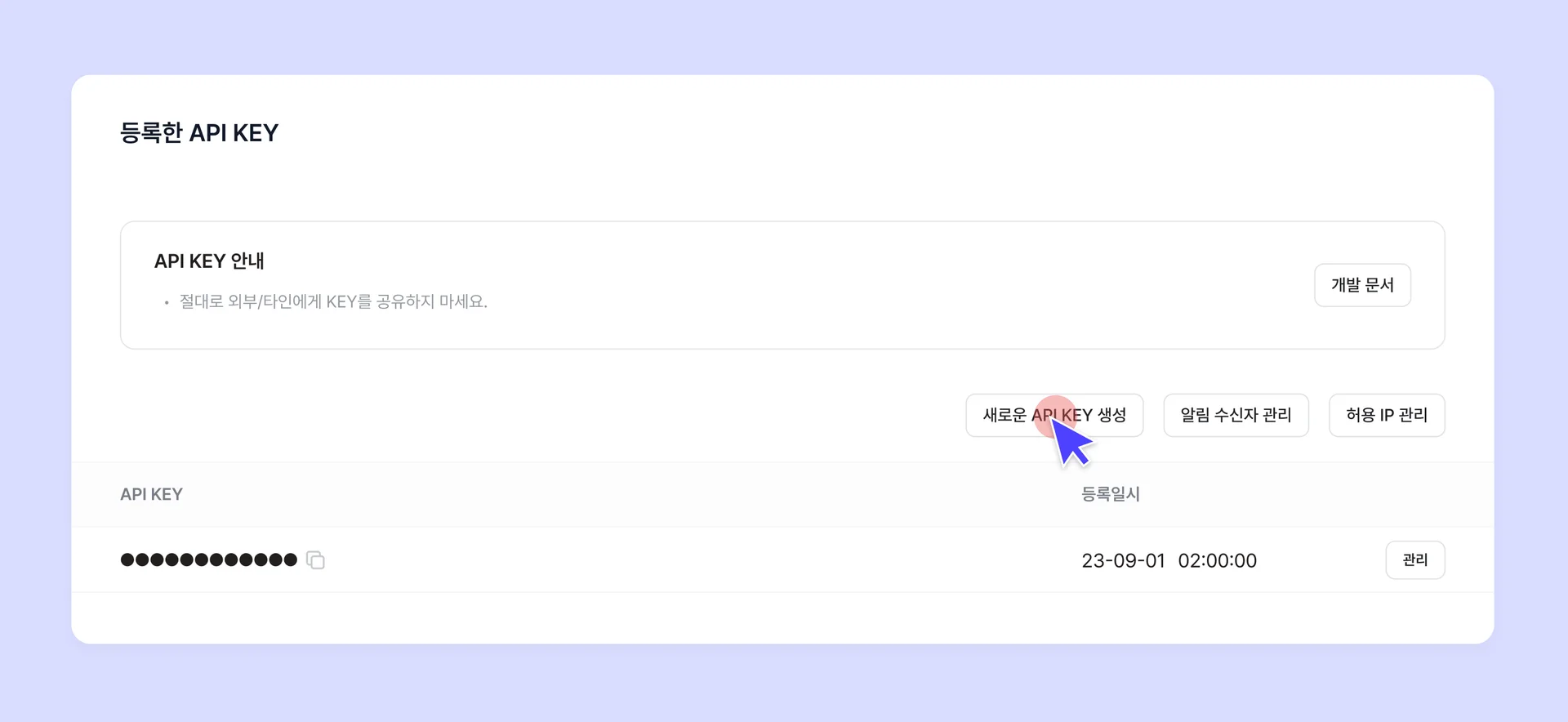 설정 경로: 개발자센터 > API KEY 관리 > [허용 IP 관리]