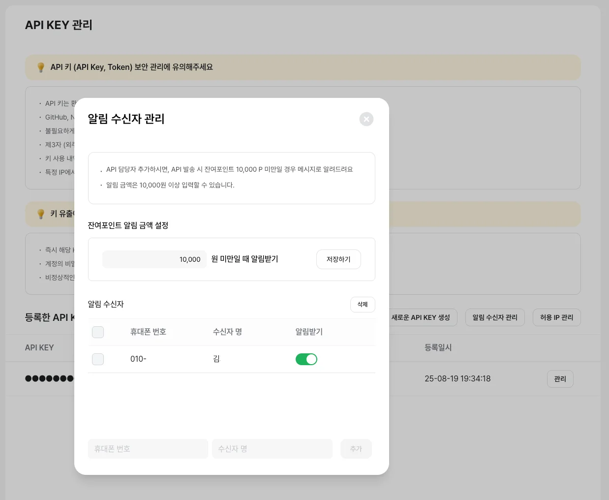 설정 경로: 개발자센터 > API KEY 관리 > [알림 수신자 관리]