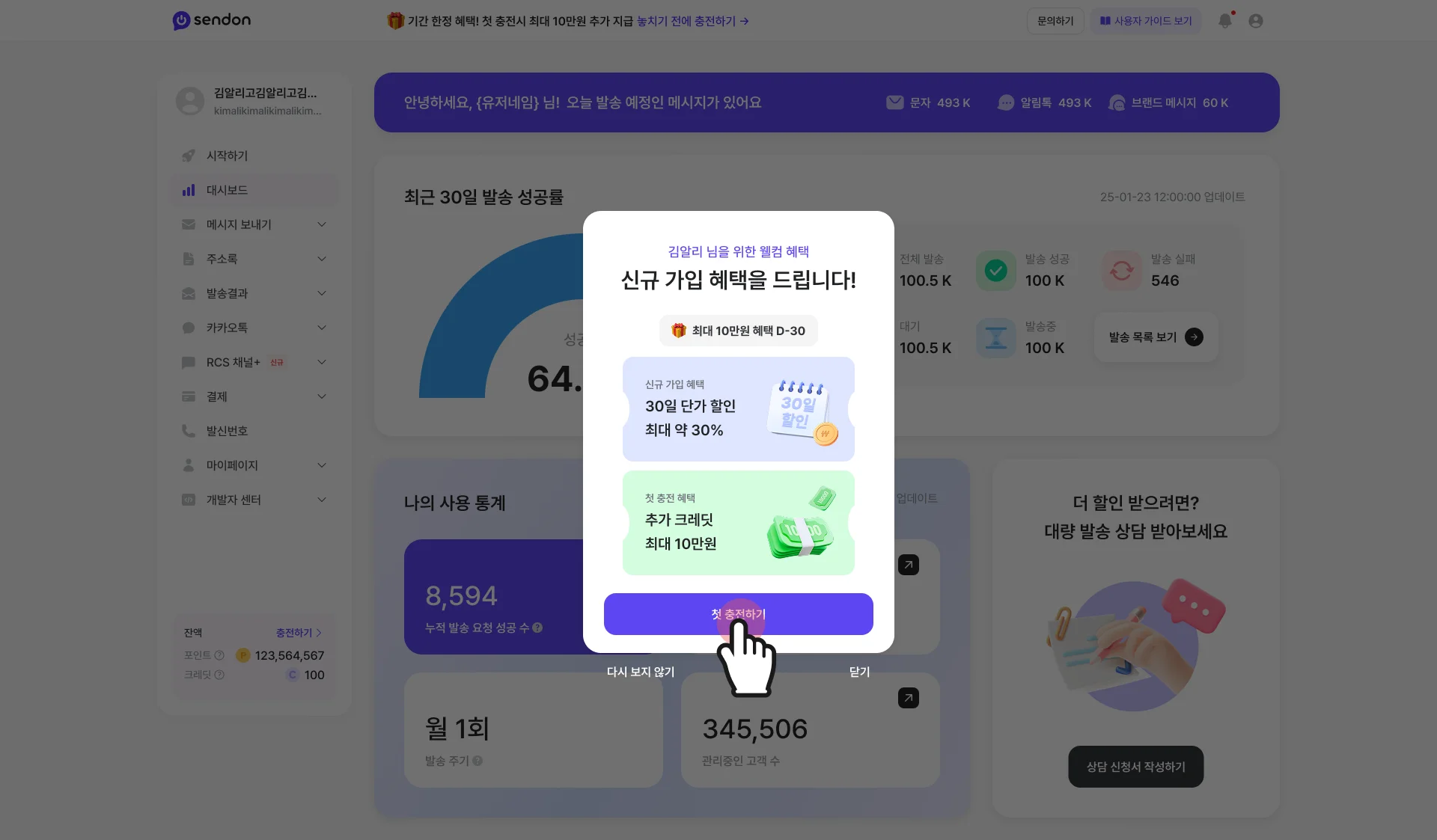 지금 센드온에서 첫 충전 혜택을 바로 누려보세요! 🚀