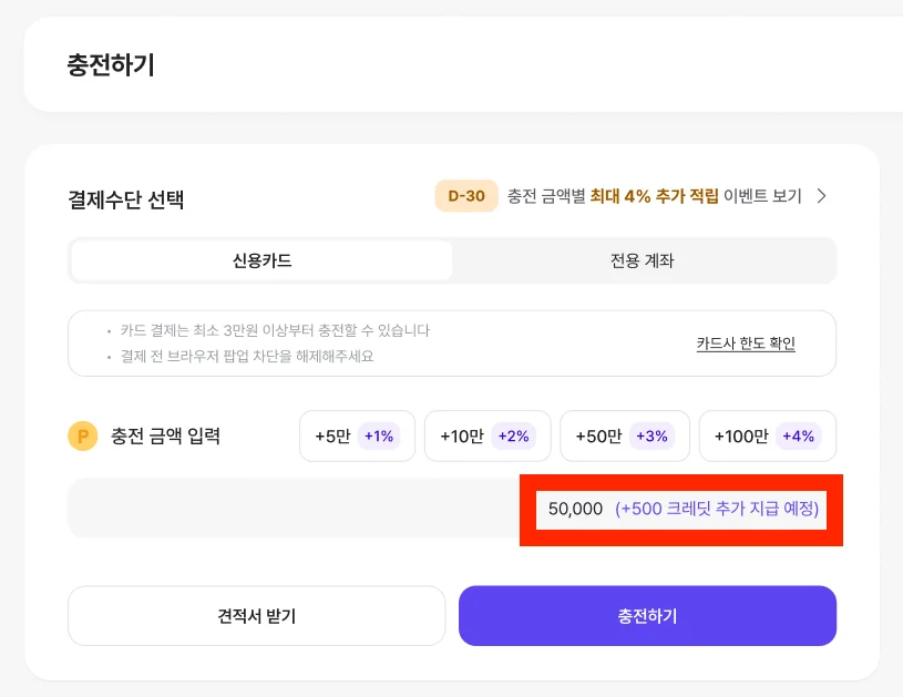 충전 금액을 선택하면, 받게 될 추가 크레딧이 실시간으로 표시됩니다.