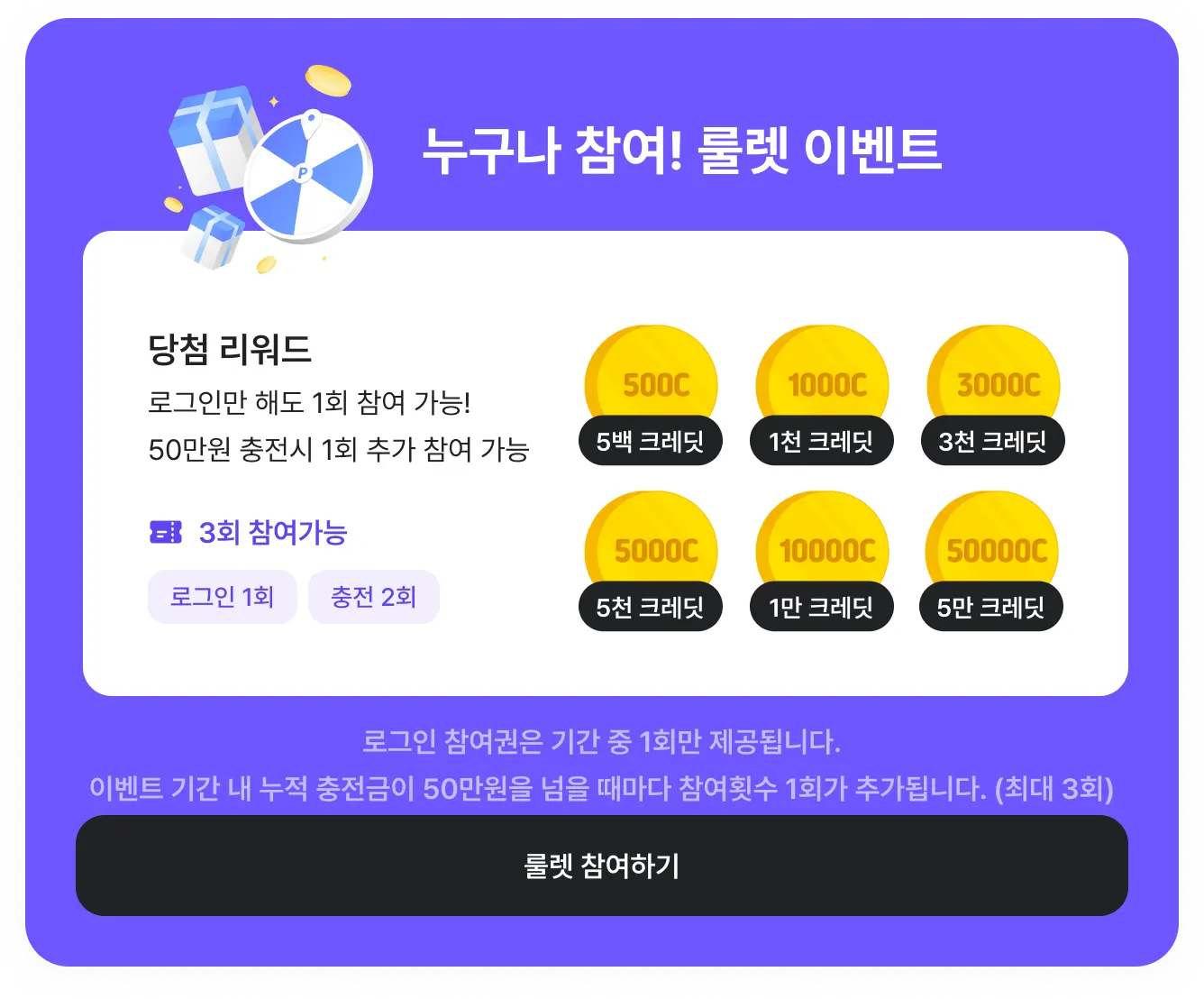참여권이 발급된 이후에는 사용자가 직접 크레딧 룰렛을 돌리는 방식으로 진행돼요! 이벤트 기간 내에 룰렛을 꼭 돌려주세요!
